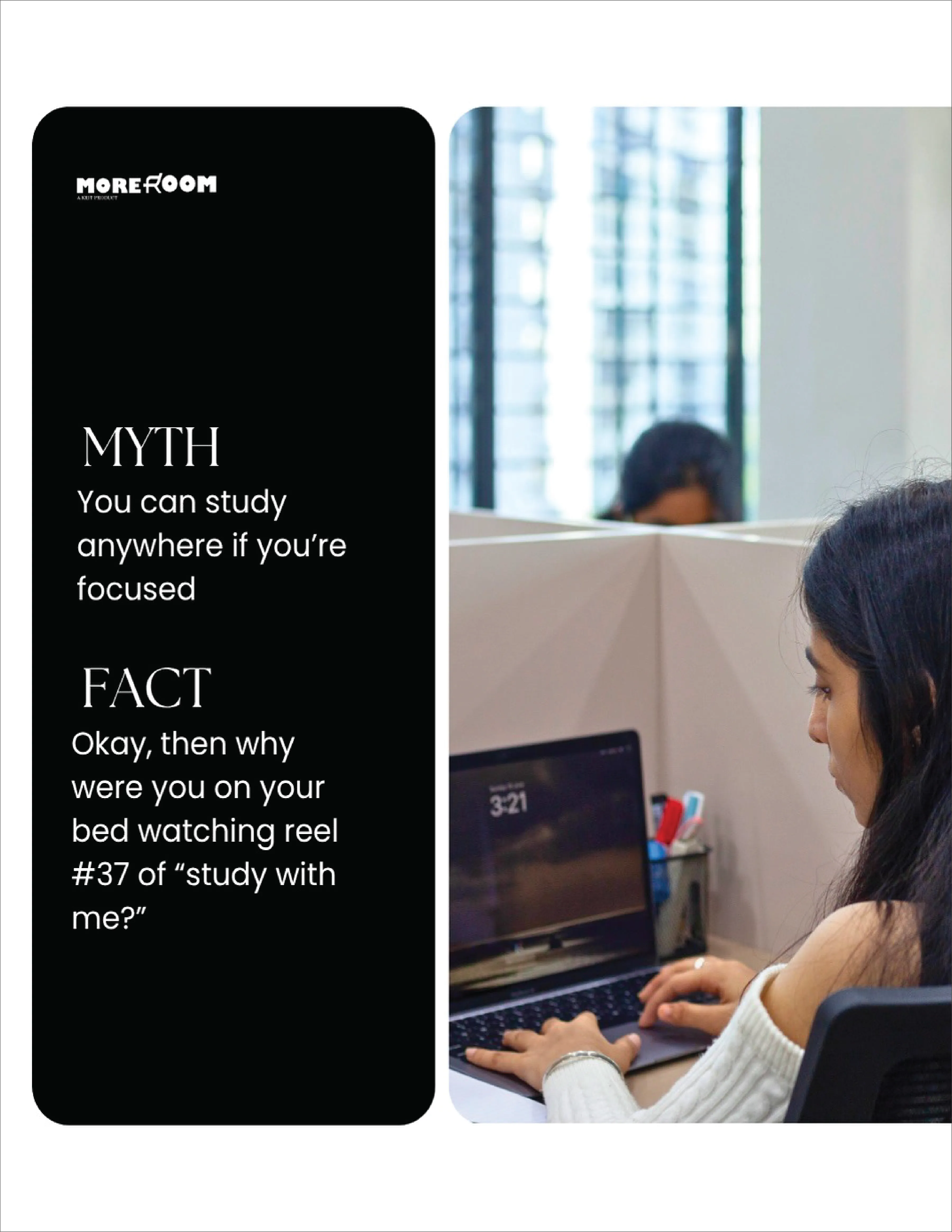 More Room is a premium rental study space designed to foster focus and productivity. As the brand’s media agency, we led its social media marketing and influencer partnerships, strengthening digital presence, enhancing brand perception, and driving awareness among the student community.